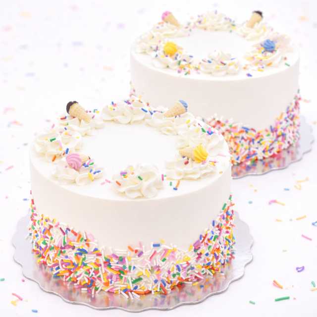 A three-layer vanilla cake bursting with colorful sprinkles baked right in!